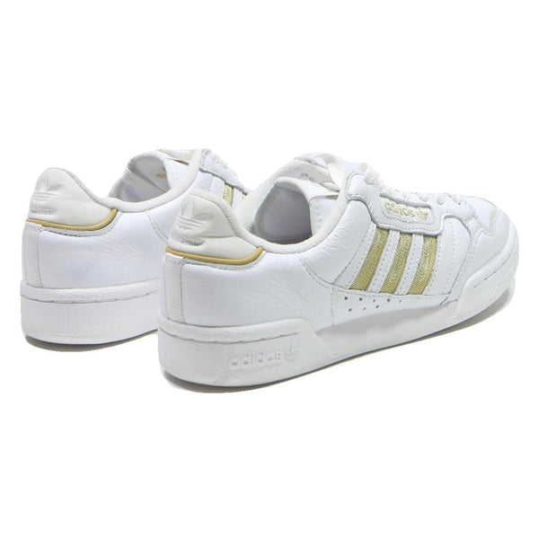 These Adidas Continental 80 trainers for women showcase a classic low top design with a white leather-look synthetic upper accented by gold detailing on the signature three stripes and branding text. The shoes feature perforated vents on the side for added breathability and a cushioned collar for extra comfort. The Adidas trefoil logo is embossed on the heel and tongue, granting authentic branding.