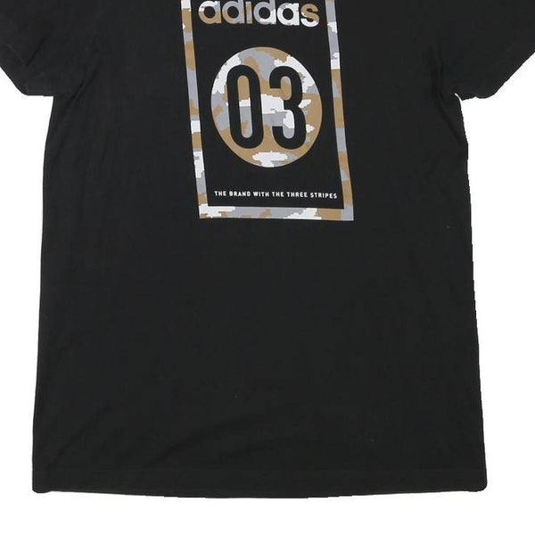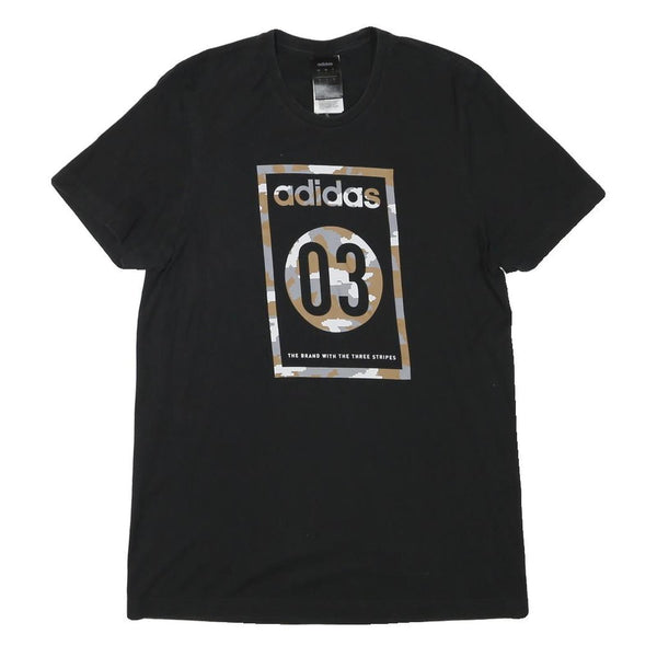 This Adidas Mens T-Shirt features a striking black base with a graphic print on the front. The design showcases the Adidas name above a large "03" inside a rectangular frame accented with a camouflage pattern in brown, white, and grey tones. Below the number is the phrase "The Brand With The Three Stripes," highlighting Adidas' iconic branding.