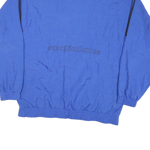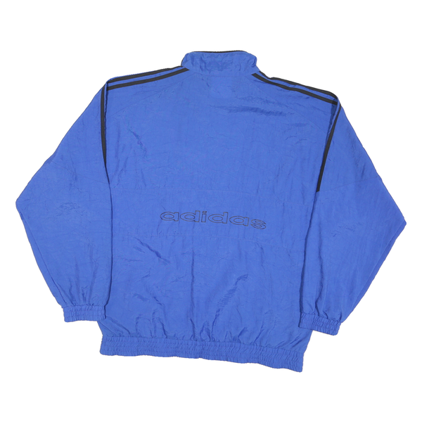 This Adidas Mens jacket features a vibrant blue colour with contrasting black Adidas signature three stripes running along the shoulders and sleeves. The front displays the iconic Adidas Trefoil logo embroidered on the chest, while 'adidas' is printed boldly across the back. It is finished with elasticated cuffs and hem for a snug fit.