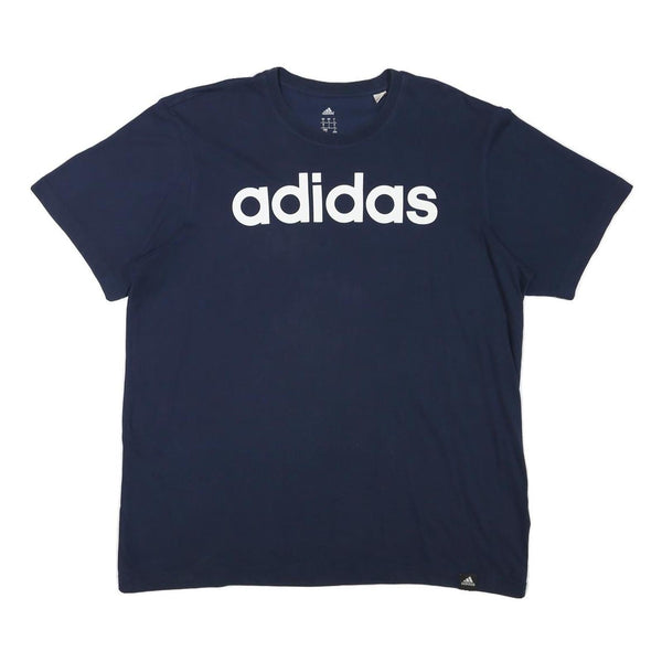 This men's Adidas T-shirt features a bold white adidas logo printed across the chest against a deep blue background. The design is minimalistic with no additional graphics or patterns, accented by a small Adidas woven label at the lower hem. It has a classic crew neckline and short sleeves, perfect for casual or sporty wear.