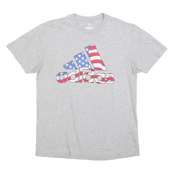 This Adidas Mens T-shirt features a light grey base colour with a bold Adidas logo prominently displayed on the front. The logo is rendered in an American flag design, incorporating red, white, and blue stripes and stars, making it a striking graphic element. The crew neck and short sleeves provide a classic and comfortable fit.