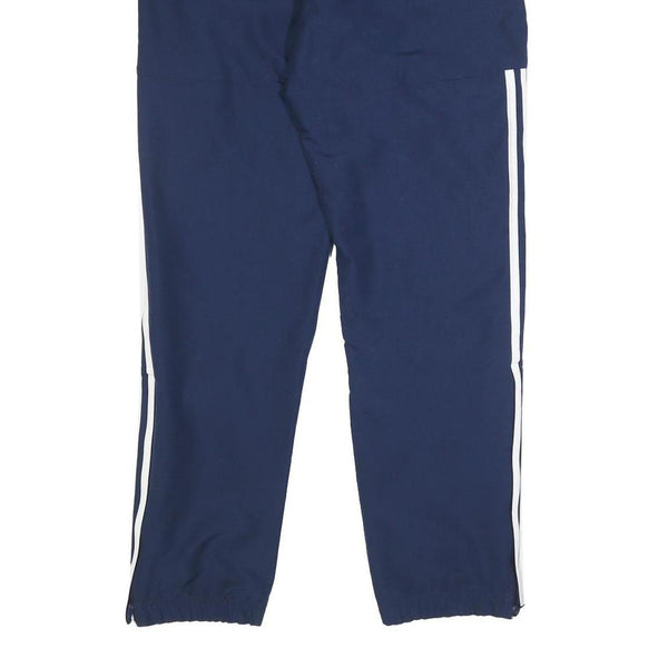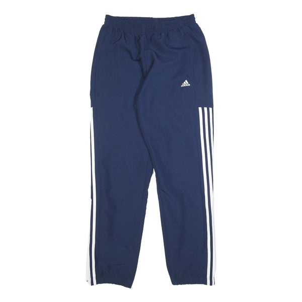 These Adidas joggers feature a navy blue base with classic white three-stripe detailing running down the outer sides of each leg, complemented by a small white adidas logo on the front left thigh. They are designed with an elasticated waistband and ankles for a snug, secure fit.