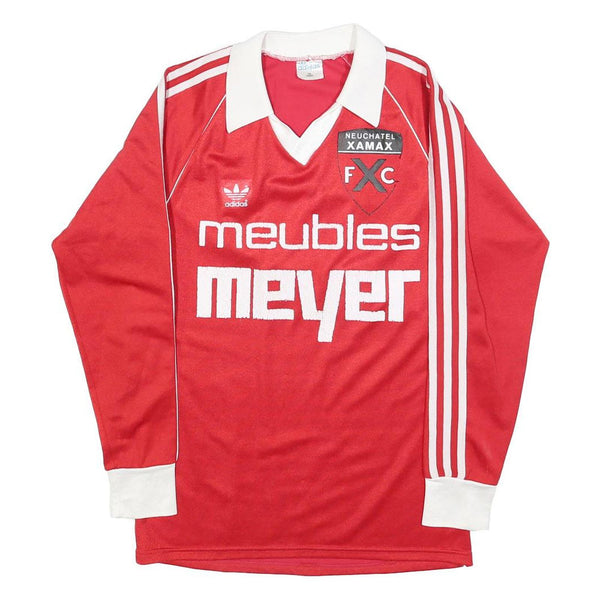This vintage Adidas football shirt features a bold red base colour with contrasting white triple stripes along the right sleeve and white cuffs. It prominently displays the Neuchatel Xamax FC club crest on the chest alongside Adidas trefoil branding and sponsor logos in large white block lettering. The classic design is completed with a white collared neckline providing a retro sportswear appeal.