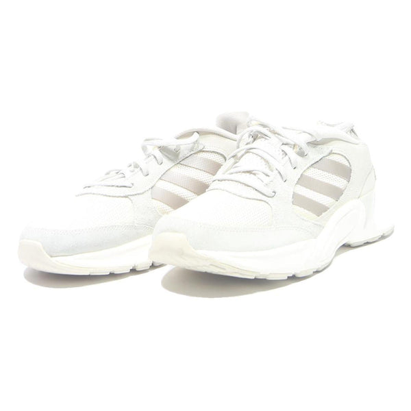 These Adidas womens sneakers feature a clean, all-white design with the iconic three stripes subtly displayed on the side panels. The shoes combine polyester mesh and synthetic overlays for a modern, breathable finish. They have lace-up fastening for a secure fit and a chunky sole that adds both height and cushioning.