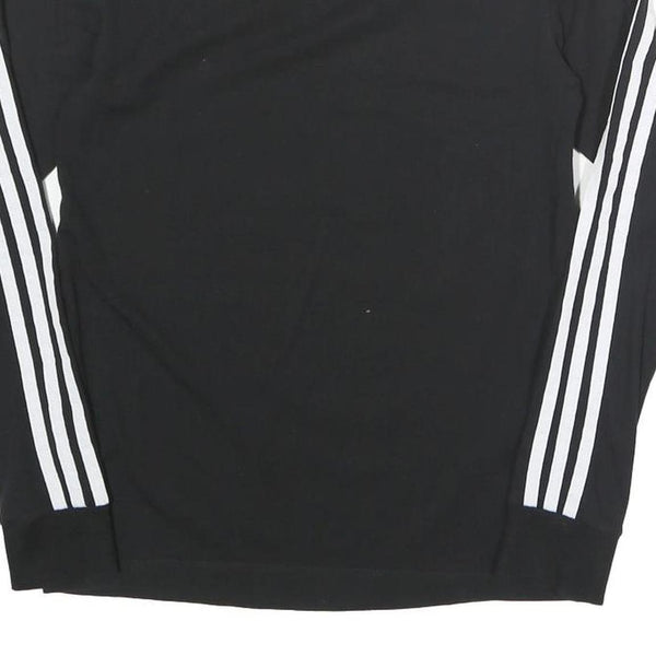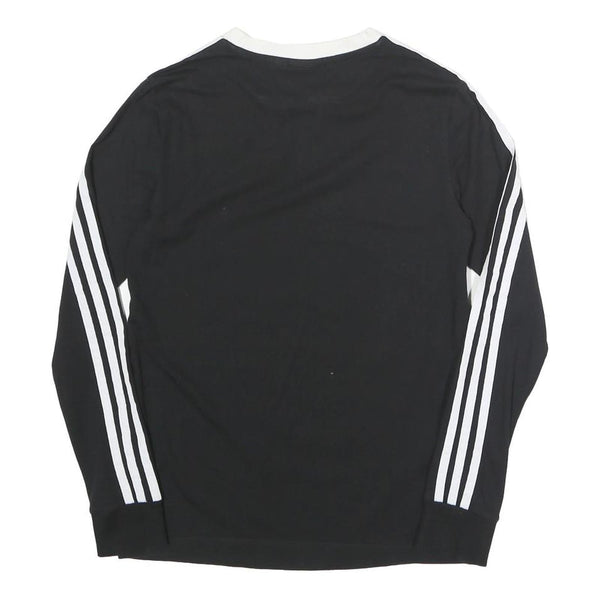 This ADIDAS womens long sleeve T-shirt features a classic black base with striking white detailing. The iconic adidas trefoil logo is embroidered on the chest, complemented by the brand's signature three white stripes running down each sleeve to the cuffs. The neckline is finished in white, adding bold contrast to the design.