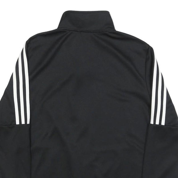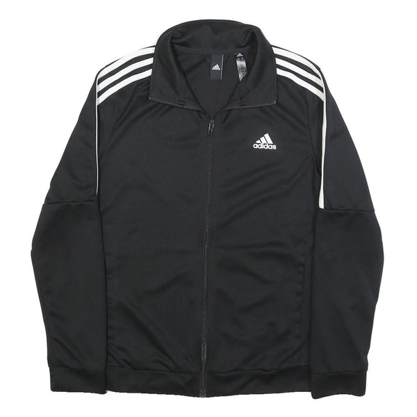 This Adidas womens jacket features a sleek black design accented with the signature three white stripes running down the shoulders and sleeves. The front showcases the Adidas logo on the chest, adding a classic sporty touch. It has a full zip closure and a stand-up collar for a neat and modern look.