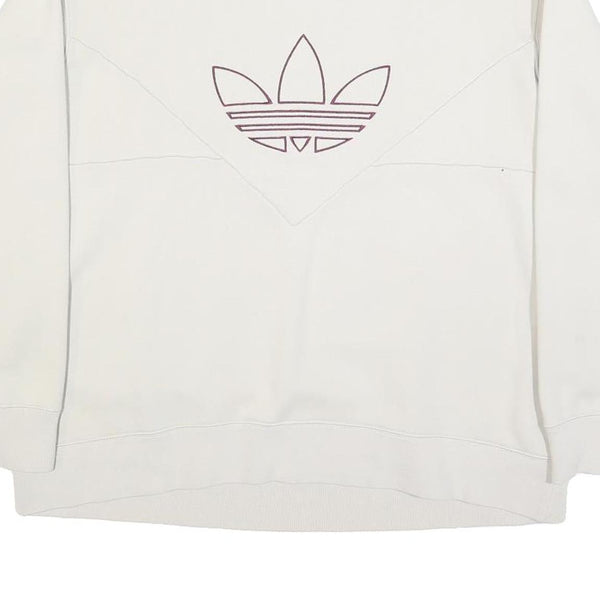 This womens Adidas sweatshirt features a soft cream colour with a distinctive outline of the classic Adidas trefoil logo embroidered in a muted purple on the chest. The design includes a subtle chevron stitch detail in the same cream tone across the upper chest, adding subtle structure and style.