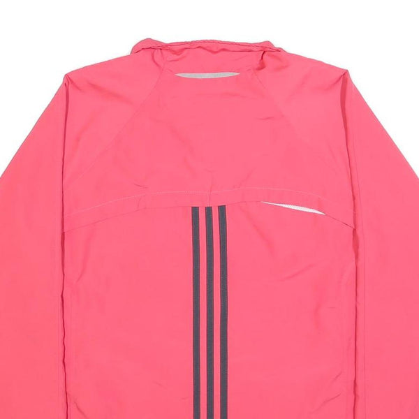 This Adidas womens jacket is presented in a vibrant pink colour, featuring a subtle grey Adidas logo on the front and three distinctive vertical stripes running down the back, characteristic of Adidas's sporty branding. The jacket fastens with a full-length front zip and includes zippered side pockets for secure storage.