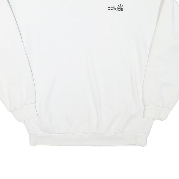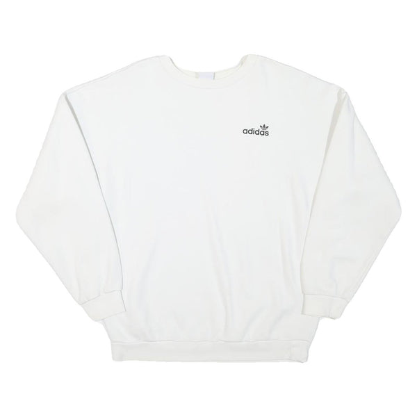 This Adidas sweatshirt showcases a clean white colour with a subtle, small black Adidas logo and trefoil emblem on the front left chest. The design is minimalist and classic, perfect for casual wear or sporty looks.