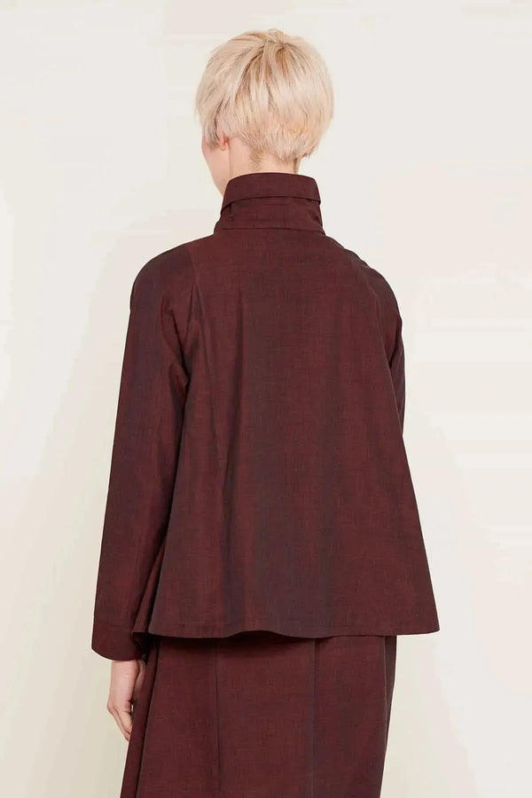 The Alexandra shirt is available in two colors: a luscious, autumnal burgundy and a more neutral lichen that brings out the deep, detailed texture of the crossweave fabric.