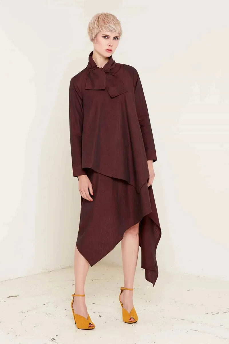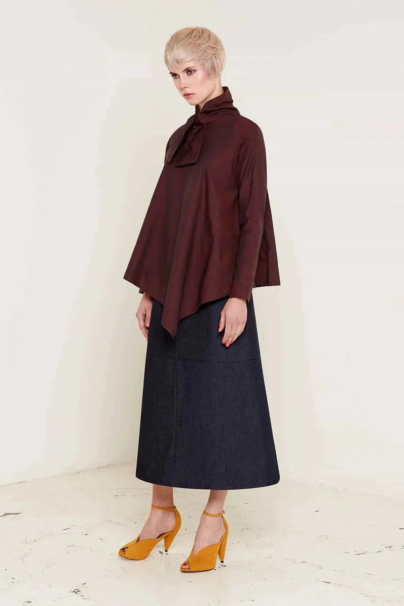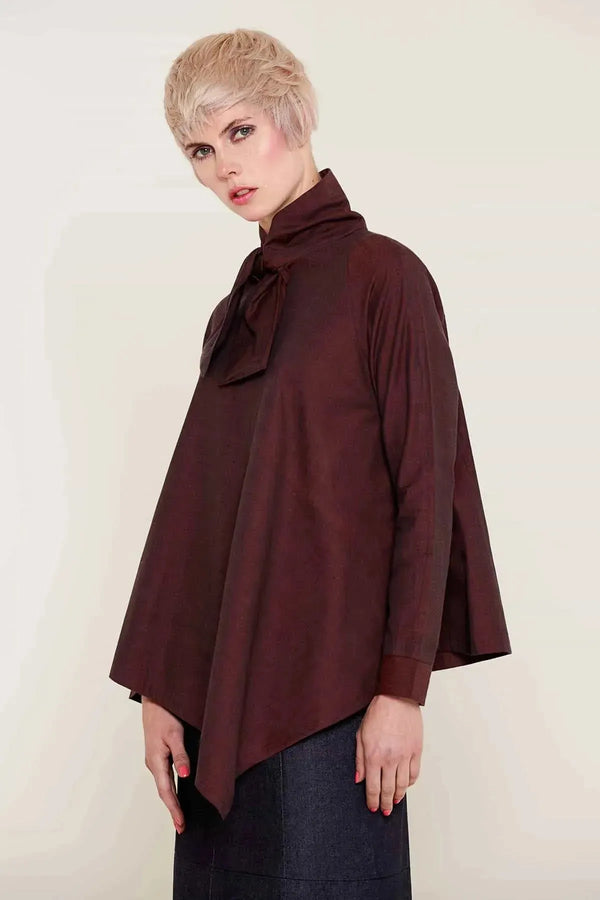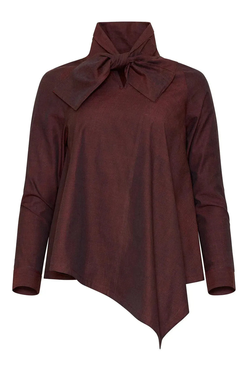The sharp, modern lines of this asymmetric shirt are softened by a delicate bow detail at the neckline and slim, full-length sleeves. The beautiful crossweave fabric is yarn dyed before weaving, resulting in a smooth, richly-colored material with a gorgeous drape.