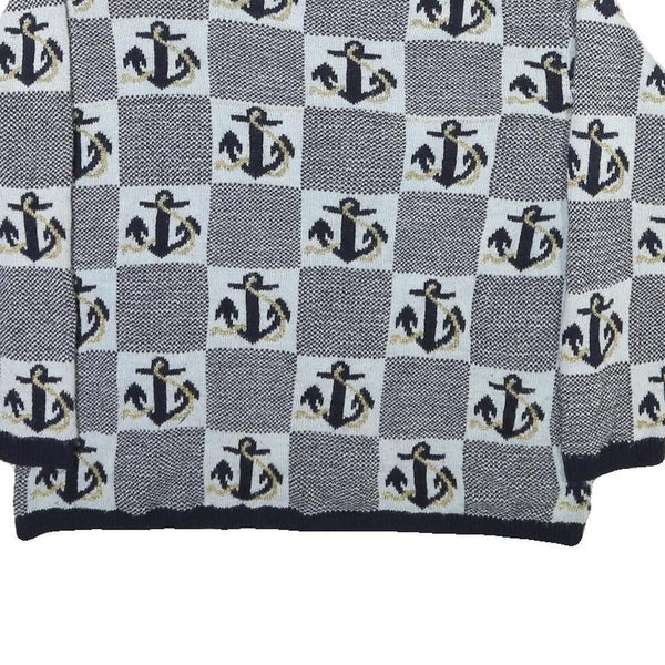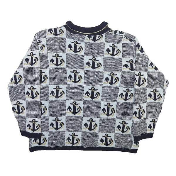 This Alfred Dunner womens jumper features a distinctive navy blue and light blue checkerboard pattern adorned with repeated anchor motifs, giving it a nautical-inspired aesthetic. The jumper has a navy blue knitted collar, cuffs, and hem that frame the overall eye-catching pattern.