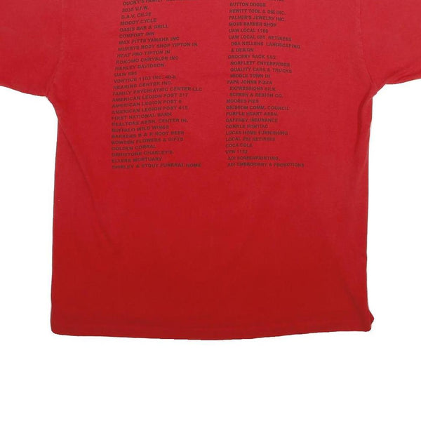 This Mens T-Shirt from ALORE features a bright red cotton fabric with a bold central graphic displaying the Marine Corps League emblem encircled by yellow rope design and text that reads '2nd Annual Albert E Shockey Detachment Semper Fidelis Semper Ft. Run'. The back showcases a detailed sponsor list in black text. The T-Shirt offers a comfortable, classic fit with short sleeves and a crew neckline, suitable for casual wear.