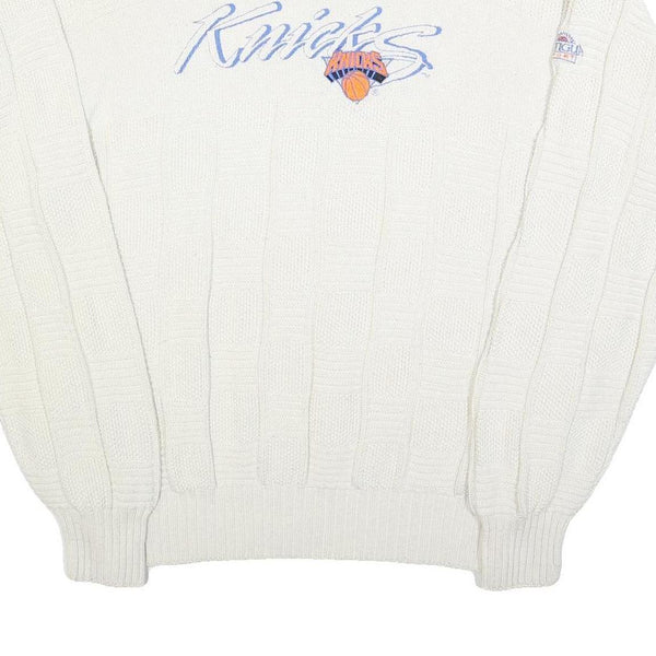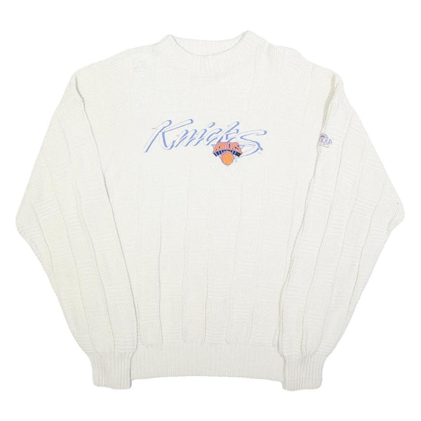 This Antigua Sport jumper features a classic white shade with a textured patterned knit throughout. The front showcases a stylish "Knicks" logo in blue text accented with an orange basketball graphic, giving it a sporty appeal. There is also a branded patch on the sleeve adding to its authentic look.