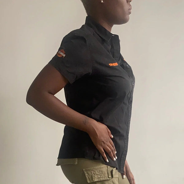 Vintage Apache Junction black Harley Davidson short sleeve shirt, fits medium.