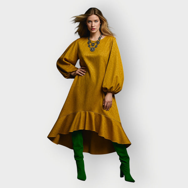 The bishop-style sleeves drape elegantly and finish with an elasticated cuff for maximum wearability, while the bottom flounce adds an eye-catching detail that's sure to capture attention wherever you go.