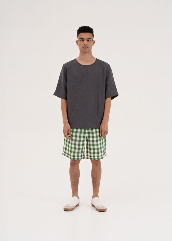 Relaxed linen shorts with a softly elasticated waistband and adjustable drawstring. Designed with a comfortable mid-length cut, they feature side seam pockets and a single back pocket for added functionality. An easy, well-balanced style made for everyday warm-weather dressing.
