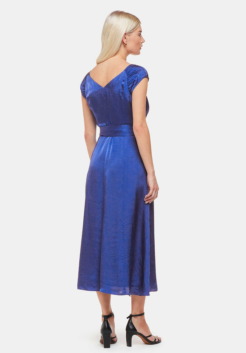 Designed in an irresistible shade of cobalt blue, this dress comes in an elegant midi length with a V-neck and a tie waist fastening. The fit is regular, and it can be cinched at the waist. Add metallic heels for ultimate elegance.