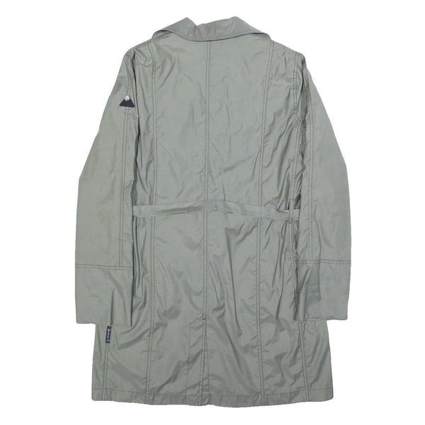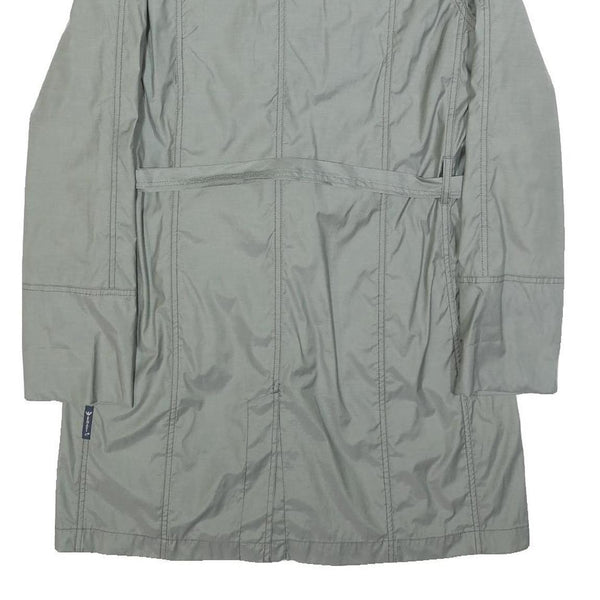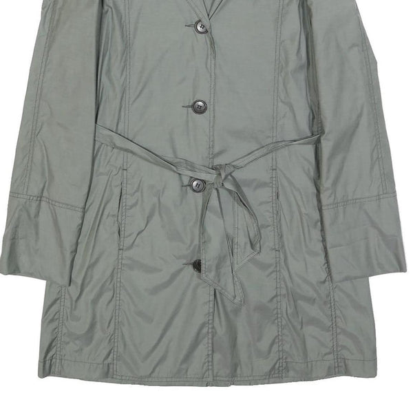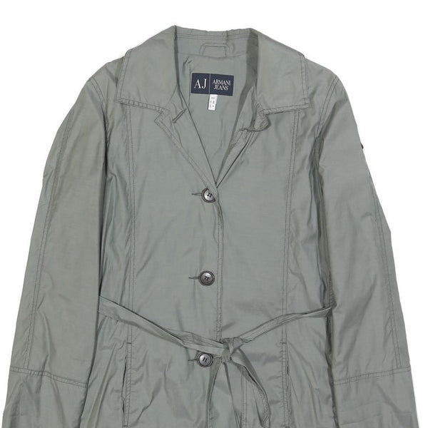 This ARMANI JEANS womens jacket features a muted grey colour crafted from a cotton blend fabric with a smooth finish. It fastens at the front with buttons and includes a matching fabric belt to cinch the waist for a tailored silhouette. The lightweight material offers comfort and versatility for transitional weather.
