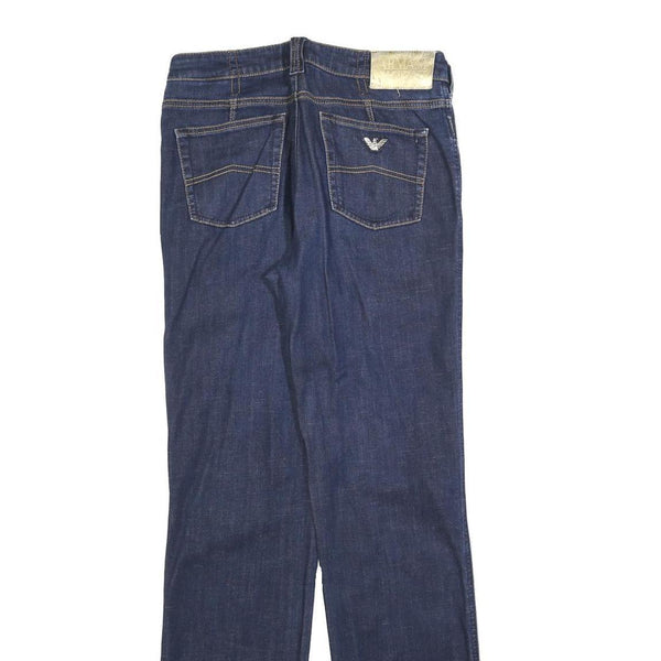 These Armani Jeans feature a deep blue denim fabric with subtle contrast stitching. The jeans have a classic 5-pocket design, with a distinctive embroidered "AJ" logo near the front pocket and the iconic Armani eagle emblem on the back right pocket. The rear also includes a branded leather patch on the waistband.