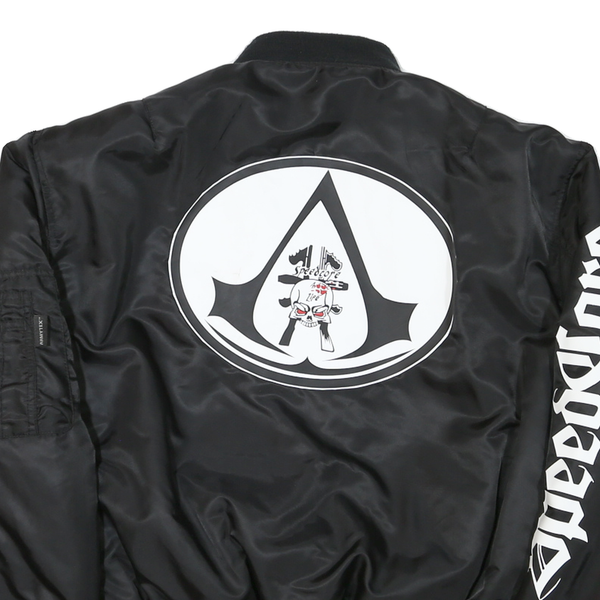 This Mens ARMYTEX bomber jacket features a sleek black outer shell with bold white Speedcore text printed on one sleeve. The back has a distinctive large circular logo with art incorporating skulls and shoes, adding a streetwear edge. The inner lining is a vivid orange, visible only when reversed.