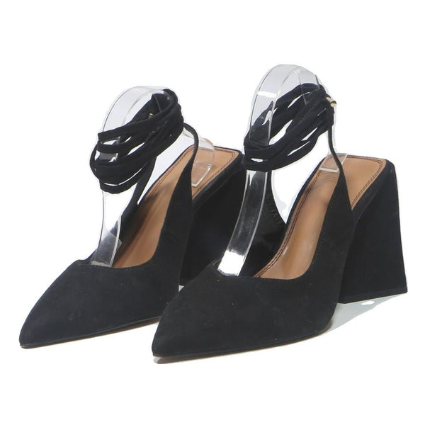 These ASOS women's heels are crafted in black synthetic material with a smooth matte finish, exuding elegance. They feature a pointed toe design and an ankle strap that ties around the ankle for a secure fit and added style.