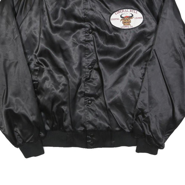 This men's jacket from AUBURN SPORTSWEAR features a shiny black satin polyester shell with ribbed collar, cuffs, and waistband. The front has a button closure and two side slit pockets. On the left chest is an embroidered patch reading "Liberal Bull Cocktail Lounge Loomis, CA" with a cartoon bull design.