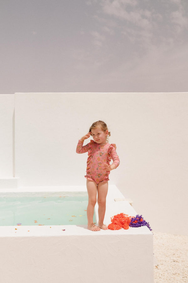 The recycled Aurelia swimsuit in this seasons Bohemian strawberry print is here! Recycled Aurelia Girl's swimsuit is made from an SPF 50 protective fabric covering the entire upper body. It is surf style one-piece swimsuit with ruffles on the front and around the thighs. For easy wear, there is a zipper with a protective cord. It is made with recycled materials and SPF 50 protection in a Bohemian strawberry print by Louise Misha.