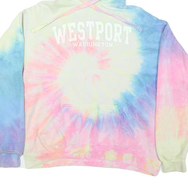This womens hoodie features a vibrant multi-colour tie dye pattern blending pastel shades of blue, pink, yellow and purple. The front bears white text reading "WESTPORT WASHINGTON" in varsity style block lettering across the chest. It has a classic pullover design with a hood and front kangaroo pocket.