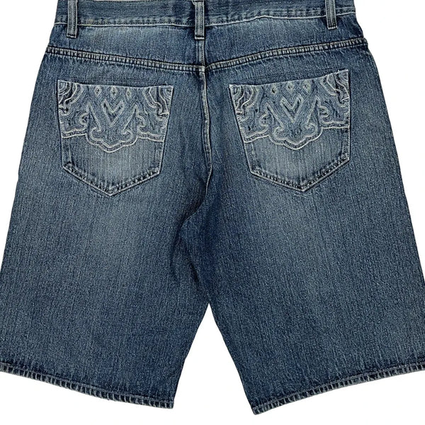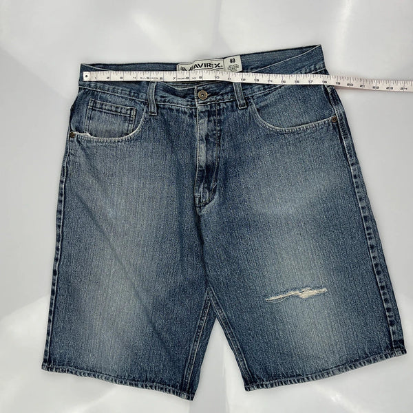 Avirex Denim Shorts, fit a 34″ Waist and 11″ inseam.