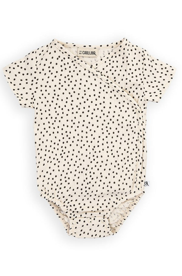 The baby body, with its kimono-style design, is a charming addition to your little one's wardrobe. The off-white and the black color combination brings a stylish flair. Made by CarlijnQ from the Netherlands, this baby kimono bodysuit is part of their "What I Like" collection, perfect for revamping your baby's summer clothing. The convenient snap buttons make changing a breeze, ensuring your baby stays comfortable during their wardrobe journey. With its snug fit in newborn size, this baby body suit is truly worthy of celebration.