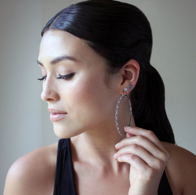 Our Bamboo hoop earrings are intricately carved with a modern bamboo inspired motif. These extremely versatile and thin hoop earrings will make you never want to go back to a basic hoop again. Perfect for anyone who loves big earrings but has sensitive ears and needs a lightweight earring style.