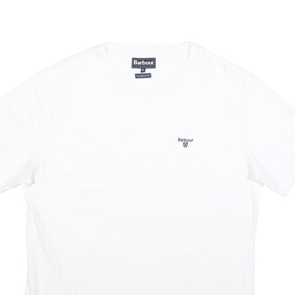 This Barbour mens T-shirt comes in a crisp white colour featuring a small, subtle Barbour logo graphic embroidered on the chest. It has a classic crew neck and short sleeves for a timeless, casual look.