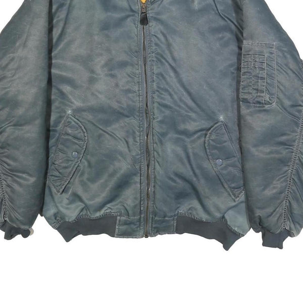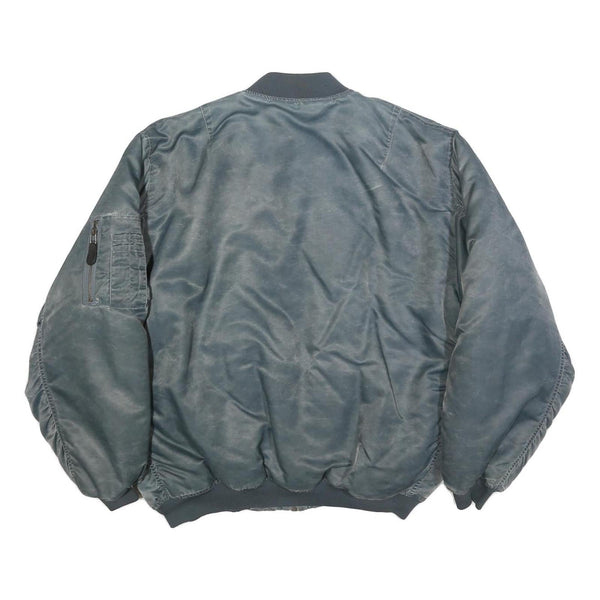 Crafted from durable nylon, this jacket offers a smooth finish with a quilted feel and a relaxed fit typical of flight jackets. It has a military-inspired style with practical elements, suitable for casual wear or layering. The item shows signs of use consistent with its pre-loved fair condition, including some dulling and wear marks on the nylon surface.