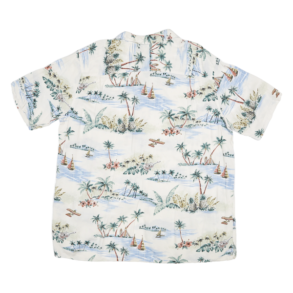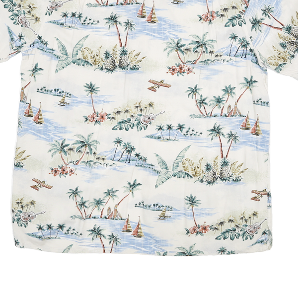 This Mens BATAK BAY shirt features a bright white base colour decorated with classic Hawaiian motifs including palm trees, sailboats, tropical flowers, guitars, and vintage planes in gentle shades of blue, green, brown, and coral. The pattern covers the whole shirt, giving it a lively island vibe perfect for summer wear.