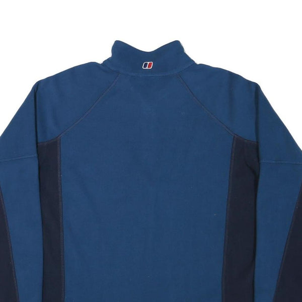 This Berghaus mens jacket features a stylish two-tone design in blue and navy shades. It has a half-zip closure and a stand-up collar with a small logo detail at the back. The front chest is adorned with a subtle embroidered Berghaus logo in white and red.
