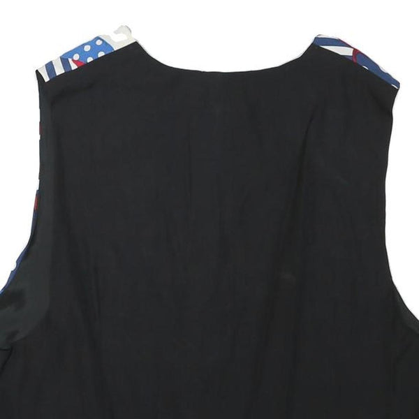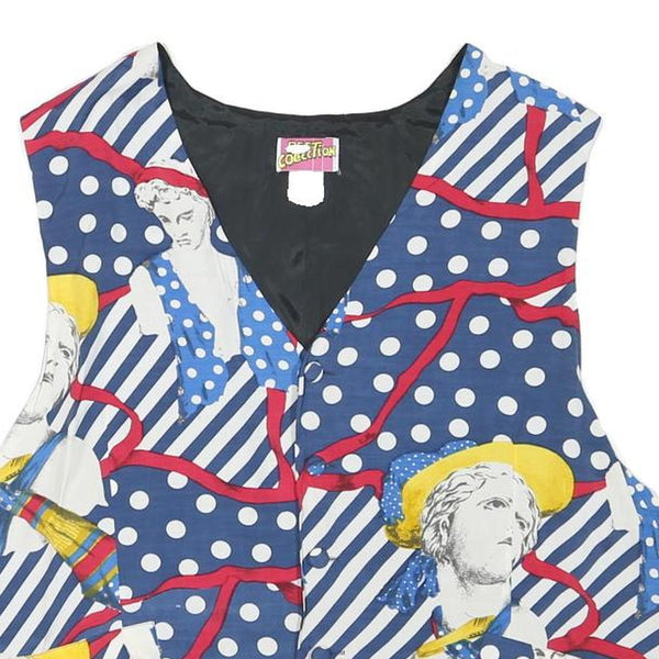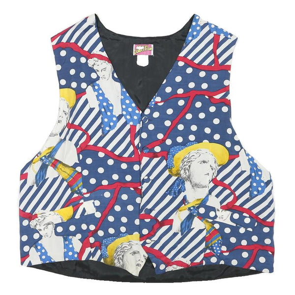 Constructed from a polyester blend, this jacket offers a smooth and lightweight feel with a relaxed fit. It fastens with buttons down the front and has a sleeveless design, making it a perfect layering piece or statement item for casual and creative ensembles. The unique artistic print adds an eye-catching, avant-garde look.