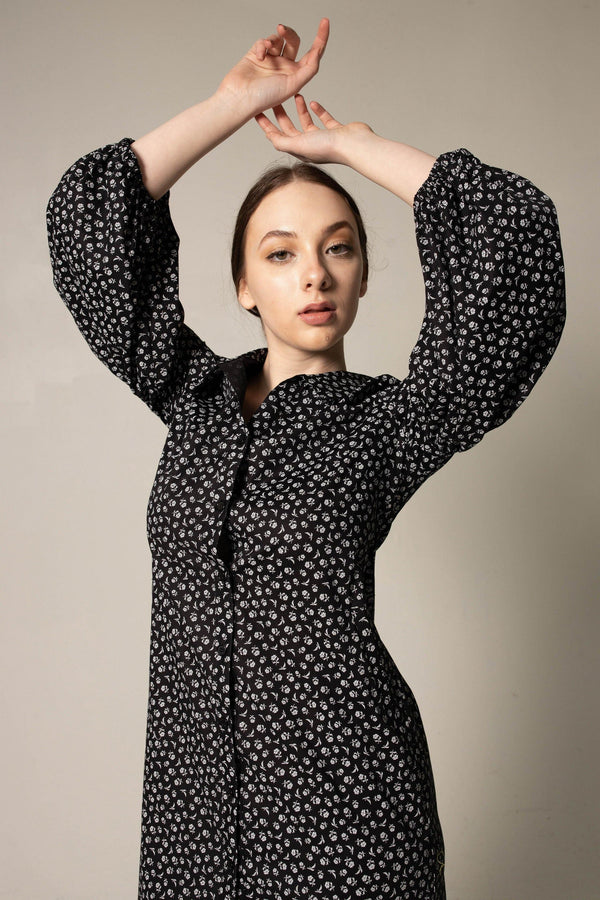 Black floral shirt dress for work and business wear from Le Réussi. This designer mini-length dress is perfect for day and night wear. The perfect mix of chic and elegant.
