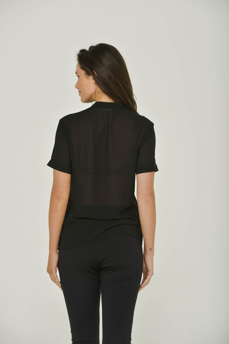 One wardrobe essential is a black split-neck short sleeve top that can act as a blouse or layered like a short sleeve cardigan. Brilliantly cut for a flattering silhouette, this matte black blouse features a feminine button placket, allowing various styling options. Made in the USA from 100% Recycled Polyester Chiffon, this blouse features OEKO-TEX® Standard 100 certified eco-friendly fabric. It is free from harmful chemicals and dip dyed for a stunning earth-friendly addition to your essentials' wardrobe.