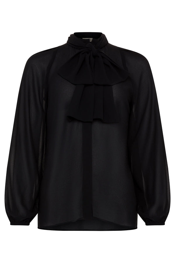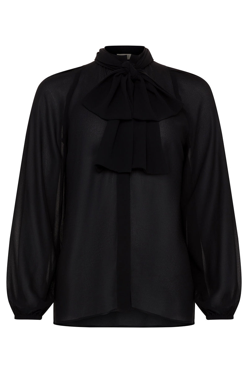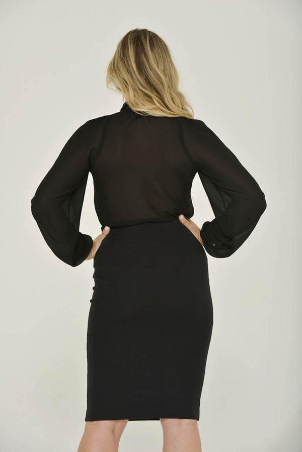 Transition from business to casual with this black semi-sheer mandarin collar blouse with bishop sleeves and a dramatic optional bow, for countless styling options. Both the blouse and pussy-bow are made in the USA from 100% Recycled Polyester; our black chiffon is OEKO-TEX® Standard 100 certified. This blouse is dip dyed for a stunning earth-friendly addition to your essential wardrobe.