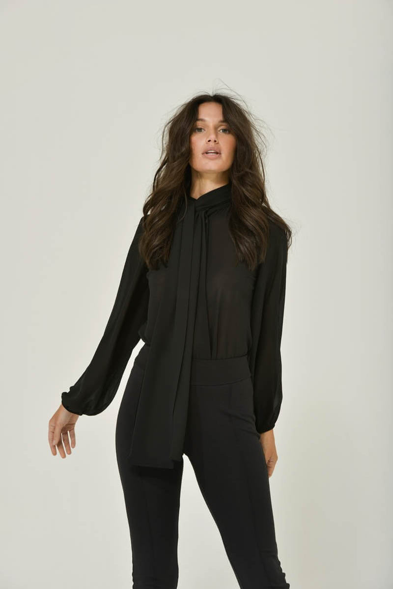Black Long Sleeve Mandarin Blouse w/ Removable Bow
