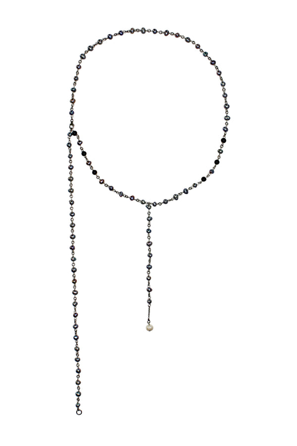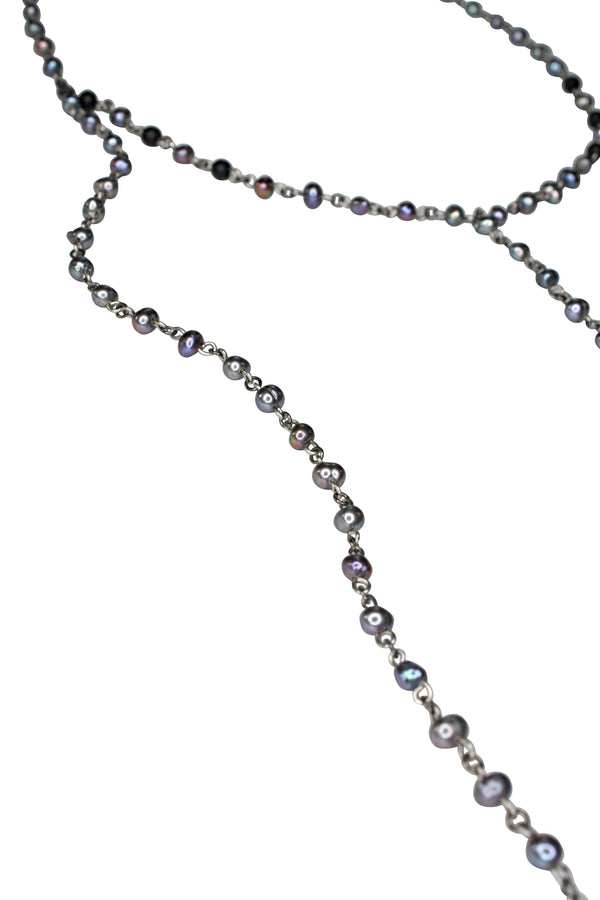 Handmade from linked black freshwater pearls with oxidized sterling loops and a 1 white pearl