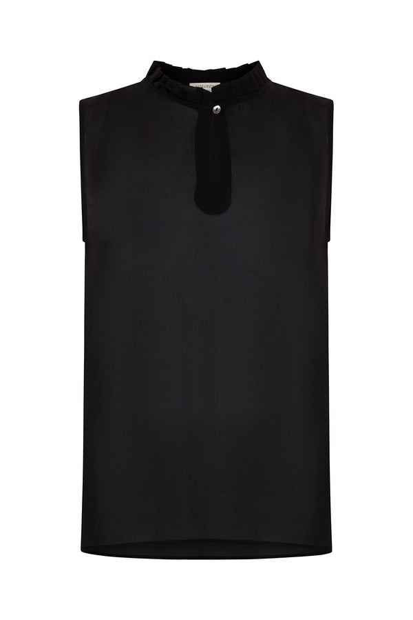 When you commit to a more earth-friendly wardrobe, layering and styling quickly become your best friend. That’s why this semi-sheer black keyhole blouse, with a delicate ruffle neck, makes for a sophisticated addition to your eco-closet. This face-shaping blouse is accented with elegant seam slits that gracefully flutter as you move for a striking silhouette.