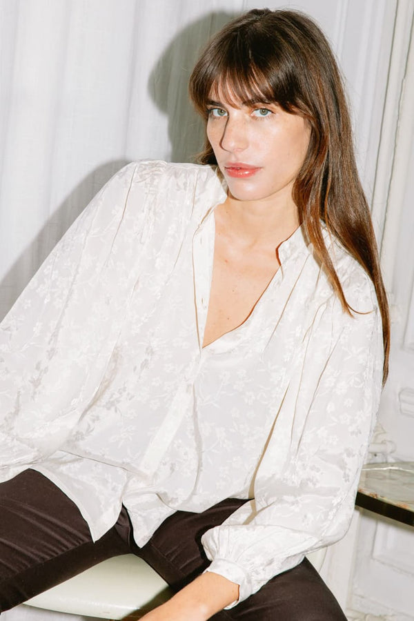 – Blouse col mao boutonnée sur le devant, manches bouffantes et épaules froncées