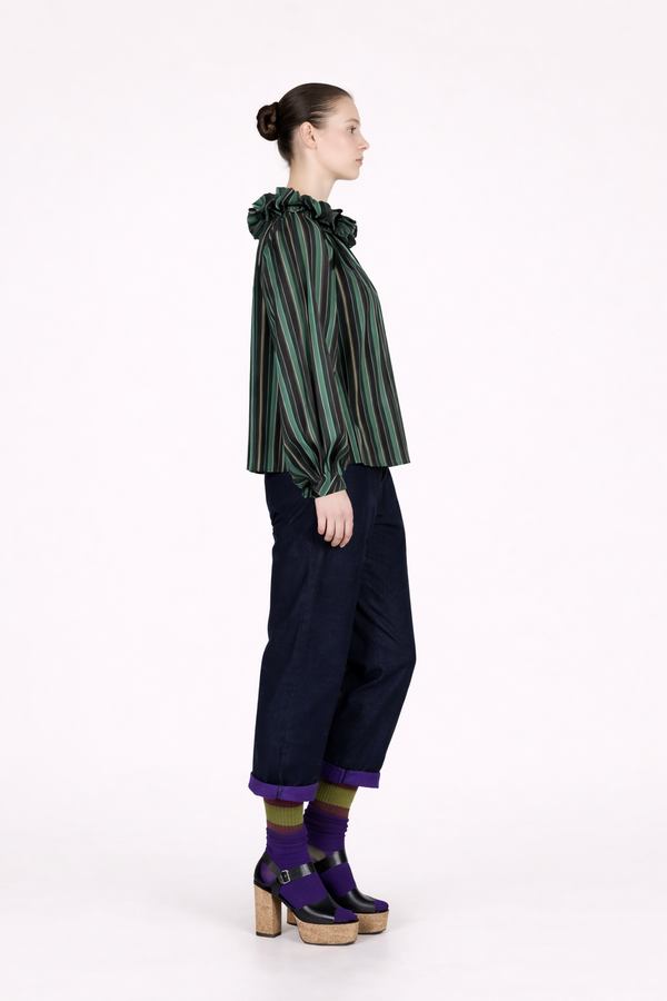 La Blouse ... incarne le mariage entre l’élégance des rayures contrastées, le raffinement du col volanté et la durabilité du coton bio certifié GOTS. Choisissez cette blouse pour allier style, confort et responsabilité environnementale.