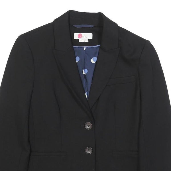 This Womens BODEN blazer jacket presents a classic tailored silhouette in black. It features a button closure at the front with two buttons, and a notched collar. The interior lining is a contrasting blue fabric with a white polka dot pattern, adding a subtle playful touch to a traditional design.
