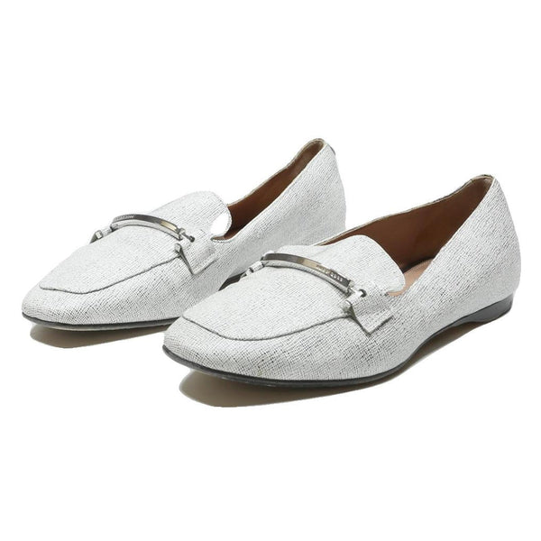 These BOSS womens loafers feature a sleek white textured leather upper with subtle black detailing for a modern and elegant look. The shoes have a classic slip-on style with a low flat sole and a silver-tone metal buckle accent on the vamp, highlighting a refined design.