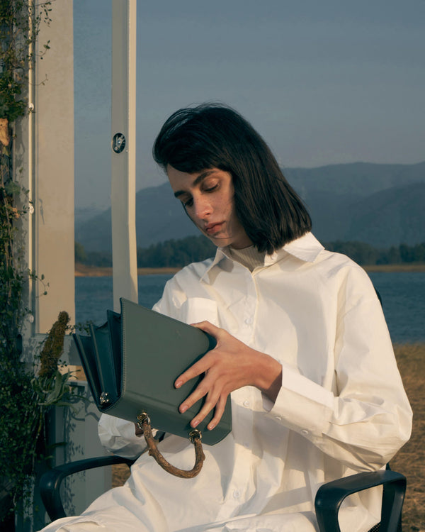 Inspired by the look of vintage books, the Boxwood bag brings a timeless and truly seasonless look. Attached with our unique Evergreen Handle made by molding real tree branches followed by hand coloring each handle. Each Evergreen Handle is unique with slight differences in color and texture.