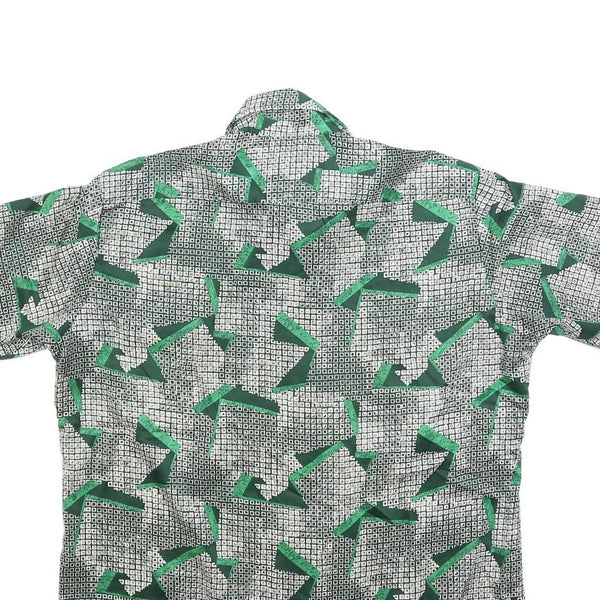 This BRAIR HOUSE mens shirt features a striking graphic abstract print in green and black on a white background. The pattern is composed of bold geometric shapes arranged over a micro grid design, giving it a retro-modern look. It has a traditional button collar and short sleeves with a classic button closure down the front.