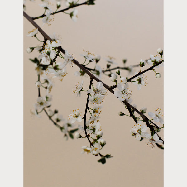 Inspired by the architecture of a cherry blossom branch and a study of abundance vs. scarcity of blooms. The warm coffee toned back drops highlights delicate details in the blossoms themselves.